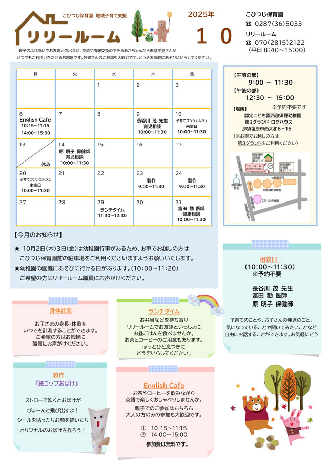 西那須野教会のご厚意で茶道の先生によるお茶会。とちぎつばさの会のご厚意で読み聞かせの会。 ハローウィン、クリスマス会などの自主イベント。 |
