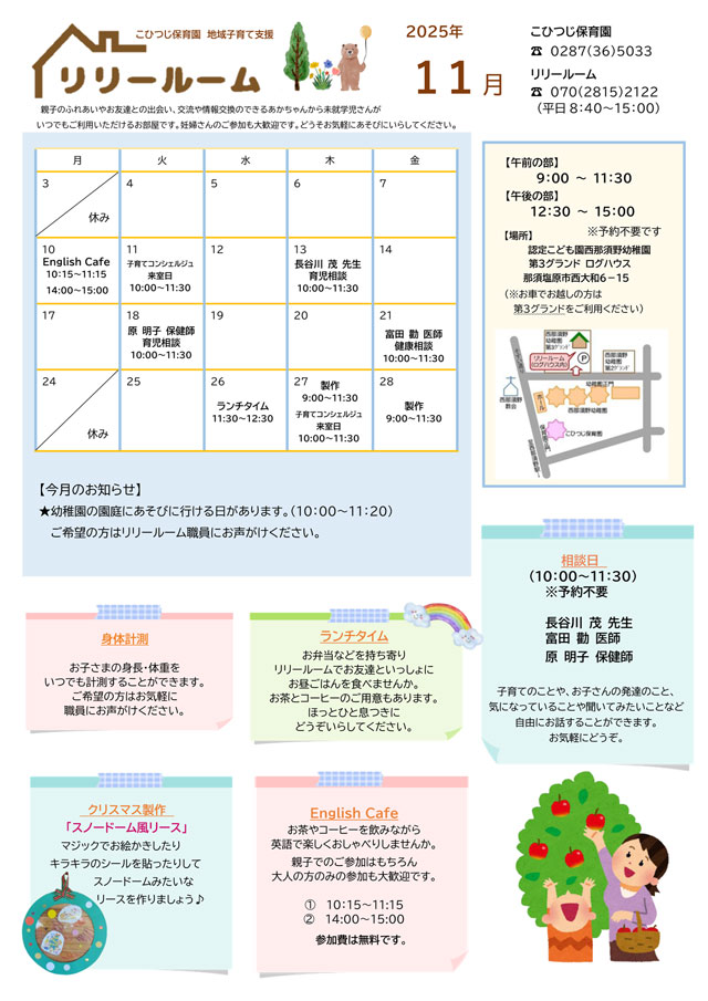 | 各種活動 | 西那須野教会のご厚意で茶道の先生によるお茶会。とちぎつばさの会のご厚意で読み聞かせの会。 ハローウィン、クリスマス会などの自主イベント。