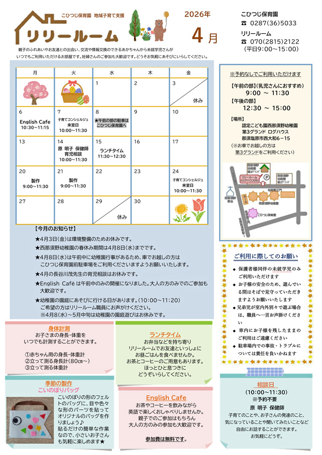 こひつじ保育園(電話:36-5033)。または開催時間中は下記予定表の携帯番号まで